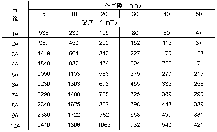 最大磁場 :工作氣隙5mm時,H≥2T